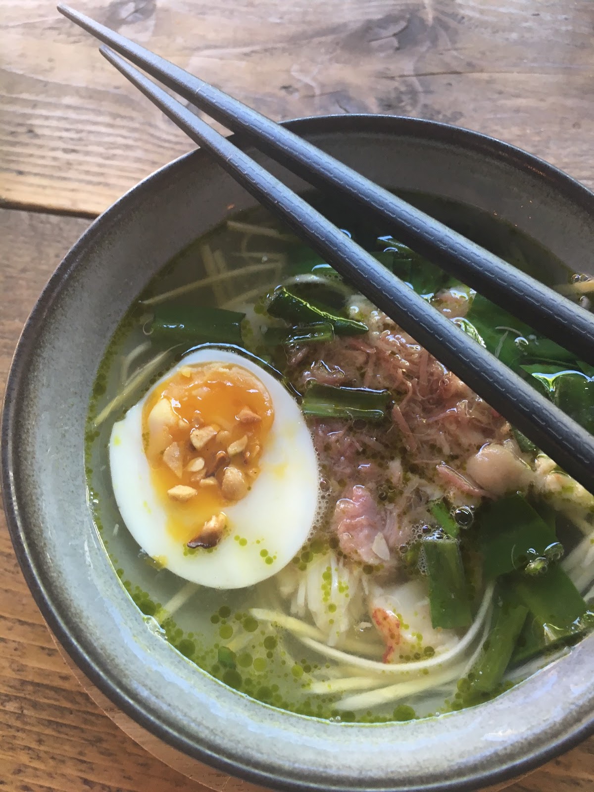 De ‘Belgische noedelsoep’, het tweede gerechtje van deze menu, ik zat er eerlijk gezegd niet echt op te wachten. Gelukkig maar dat vriendin voet bij stuk hield, want wat een voltreffer was dit niet? De noodles waren in geen velden noch wegen te bekennen, maar waren vervangen door een fijne julienne van asperge. In onze dampende kom aspergeconsommé was verder gerookte varkenspoot, Oosterscheldekreeft, lamsoor, een half eitje en peterselievinaigrette terug te vinden. ‘Boenk erop’, een waarlijk machtig gerecht! Dat er speciaal voor dit gerecht kommetjes werden ontworpen, doet mij alvast vermoeden dat een variatie hierop wel eens een vaste waarde kan worden. Hoera!