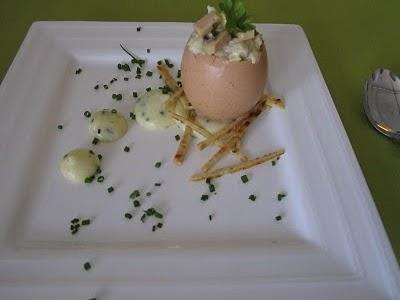* Een romig roereitje met fijne champignons, sjalot en foie gras, een nestje van Parmezaanskoekjes en een kruidige puree.