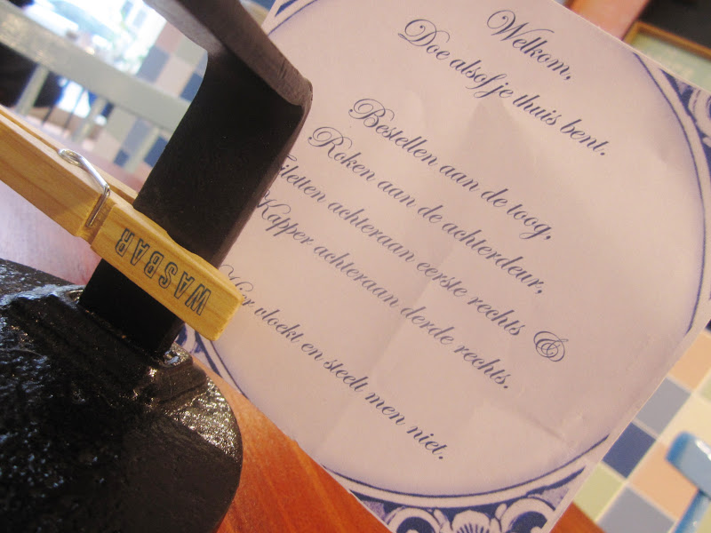 De regels des huizes - die moeten er nu eenmaal zijn wil je chaos vermijden - worden in de Wasbar middels een subtiel gepimpte wasknijper aan een antiek strijkijzer bevestigd. Binnen roken is uit den boze, vloeken af te raden en stelen ronduit verboden. Eerlijk, het moet al een erg mooi slipje zijn eer ik er in een wassalon mee aan de haal zou gaan. Je weet namelijk nooit wie dat spel heeft aangehad. Stelen? Verboden dus!