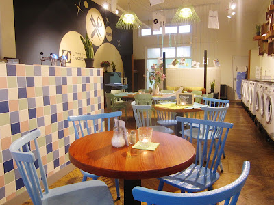 Een interieur hipper dan hip, dat nodigt uit, dus bij het krieken van de volgende dag wisten wij waarheen om ons te warmen aan een lekker drankje. Oude stoelen in een hip kleurtje, een logo dat ronduit brilliant is, een batterij wasmachines, leuke pasteltegeltjes,handige wastips en een centrale toog. Meer heb je niet nodig voor een winnertje. De niet zo subtiele logo's van de sponsors neem ik er zelfs met plezier bij. Wat maakt het ook uit dat de machines van Electrolux zijn en de wasproducten van Ecover.