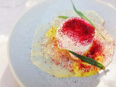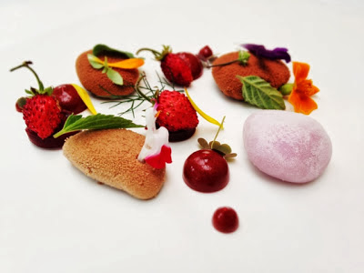 Met de 'gemarineerde goudbrasem met hibiscus, rode biet, geitenkaas en crème van wasabi' ging De Pooter onverminderd voort op hetzelfde elan. De wasabi en rode biet, doorgaans niet mijn beste vrienden kwamen hier uitstekend hetzij subtiel tot hun recht. De hand van de meester heet dat!