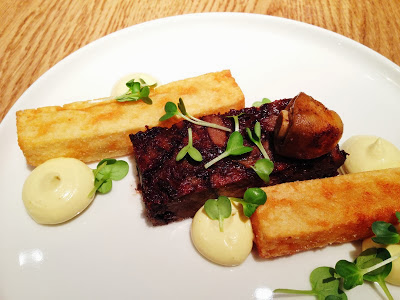 Starten deed het gezelschap met een mooi gepresenteerd bordje waarin 'haring, vitelotte, zure room en dille' de hoofdviool mochten spelen. Zo'n stukje haring weet ik altijd wel te smaken en een zwarte truffelaardappel, dat oogt altijd bijzonder mooi. Naar mijn mening had men iets royaler mogen omspringen met de zure room. Het gerecht miste net dat beetje fraîcheur en die truffelaardappelen  die wel eens wat droog durven zijn, die waren daar ongetwijfeld ook mee gebaat.