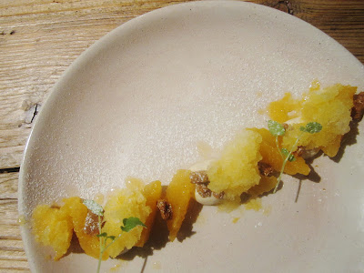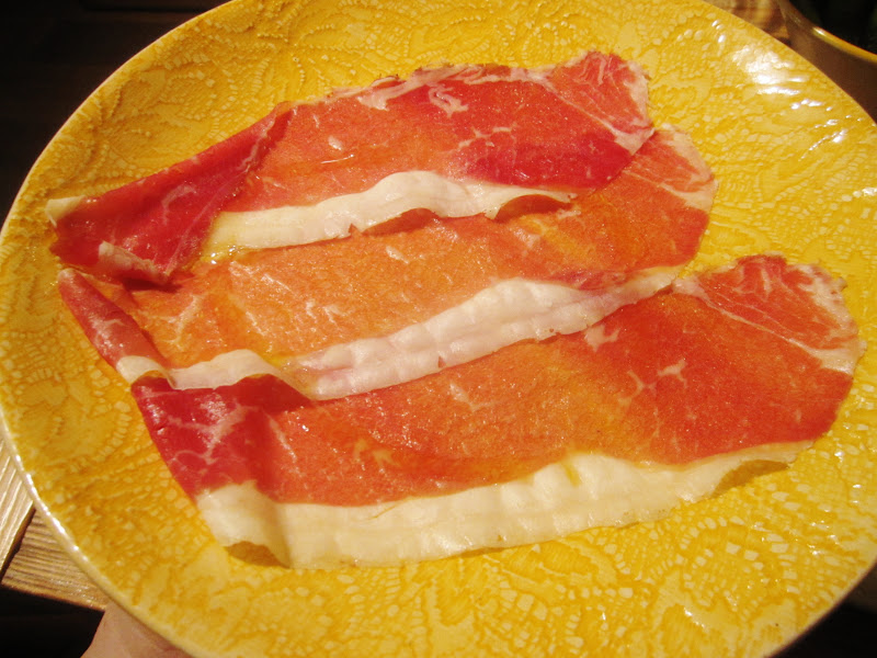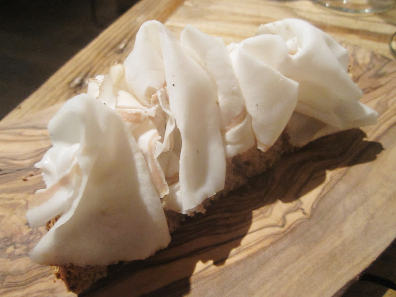 Als het op hesp en spek aankomt ben ik trouwens de eerste om toe te geven dat ik die overdreven witte randjes altijd van het vlees verwijder. Daar stond ik mooi te kijken toen de 'lardo di Colonnata' gepresenteerd werd, tussen marmeren platen gerijpt wit spek uit Carrara, welke geserveerd werd op een mooi stuk bruin brood van Huize Himschoot. Vet wegsnijden was geen optie want dan bleef er enkel droog brood over. Proberen dan maar en zowel bij Ann als mezelf viel dit enorm in de smaak. Viesneuzerij, dat is nergens goed voor zo blijkt.