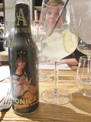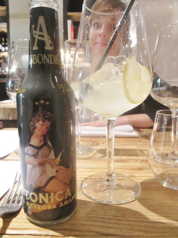 Vriendin ging voor een Prosecco bij het aperitief, voor mij mochten de bubbels uit een flesje tonic komen. Ik had immers Hendrick's en Bombay Sapphire op het schap zien staan en laat ik nu nog altijd in een 'gin craze' zitten. Uiteindelijk werd het een Monkey 47 - een uitgesproken florale gin met maar liefst 47 botanicals - en een Italiaanse tonic die het glas haalde. De wetenschap dat er zo thuis een onaangebroken fles staat. Zalig!