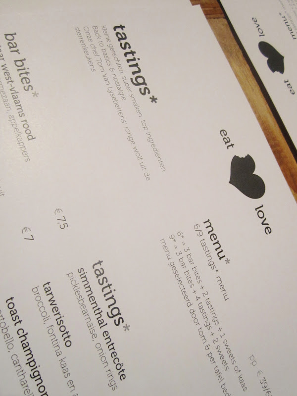 De barbites en tastings - beide kleine gerechten, de ene puur, de andere bewerkt - per stuk bestellen was een mogelijke optie, wij opteerden echter voor een door chef Tom Van Lysebettens samengestelde menu. Drie barbites, vier tastings en twee sweets, dat zou ons hongertje wel moeten kunnen stillen dachten we.