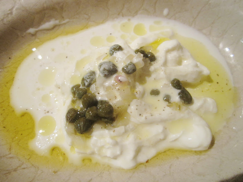 In geen tijd verschenen de verschillende barbites aan tafel en we hadden geluk. 't Bleken er geen drie maar vijf te zijn. Meer proeven, ik ben daar een onvoorwaardelijke fan van. Het eerste bordje dat eraan moest geloven was de 'straciatta di burrata'. Dat is een soort van mozzarella maar dan veel romiger, een tikkeltje draderig - als dat al een woord is - en vooral ook veel lekkerder. Een beetje olijfolie en wat kappertjes, meer was er niet voor nodig om van dit product een echt winnertje te maken. En dan te bedenken dat ik nog nooit van dit kazeke gehoord had. Schande!