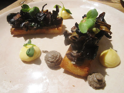 Eenmaal de barbites netjes verorberd, was het tijd voor de tastings. Opnieuw verschillende bordjes lekkers, allemaal om te delen. Wat te denken van deze prachtige 'toast champignons', een gerechtje zo simpel als lekker. Dat ongelofelijk luchtig en toch knapperig getoast brood en een mengeling van portobello's en cantharellen zo'n indruk kan maken, straf!