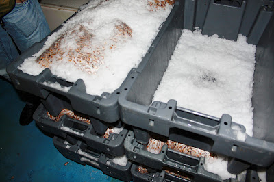 Laatste stap op de boot, het verpakken, afwegen en op ijs leggen van de grijze garnaal. Dat laatste is niet geheel onbelangrijk want ons vriendje heeft er nog een hele reis opzitten. Naar Marokko meerbepaald waar de beestjes netjes met de hand gepeld worden. Goedkopere arbeidskrachten, ik moet er geen tekeningetje bij maken.
