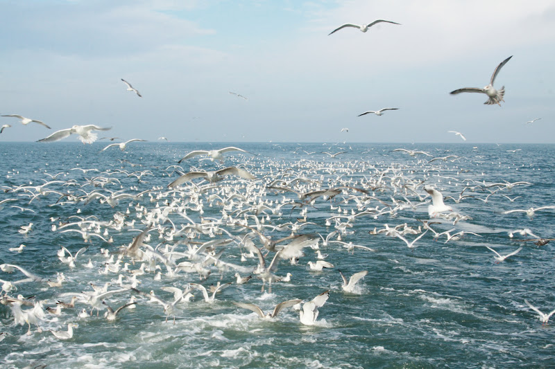 De bijvangst wordt trouwens via een vernuftig systeem gescheiden van de garnalen en gaat vervolgens levend en wel terug de zee in. Dit tot groot jolijt van het indrukwekkende aantal meeuwen welke in ons kielzog een graantje visje probeerden mee te pikken. Geloof me, ik heb mijn best gedaan om ze uit mijn hand te laten eten en dat zag er op zijn zachts gezegd redelijk belachelijk uit. Dat daar maar geen foto's van zijn.