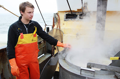De eerste schakel in de keten van het 'productieproces' van de grijze garnaal is uiteraard de belangrijkste, niet alleen voor de smaak, maar ook wat de houdbaarheid betreft. Na het filteren en wassen worden de beestjes aan boord gekookt in zeewater - al dan niet aangelengd met zout - waarna ze hun typische oranje kleur krijgen. Een kraakvers gekookte garnaal, dat is een delicatesse zeg ik u. Nogal logisch dat wij als een bende hongerige zeemeeuwen rond het kookgedeelte cirkelden. Hoe zou je zelf zijn?