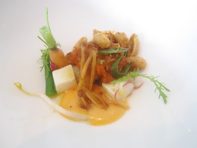De 'knipoog naar de lente' was het enige volledig vegetarische gerecht vandaag. Met de klok mee te beginnen om zes uur kregen we enkele winterse knolgroentjes, radijsjes, rode biet, romanesco, krokant van polenta, tuinboon. Een frisse, kruidige olie van basilicum zorgde voor extra accenten en de jonge geitenyoghurt was ideaal om in te dippen. Met het mini speltbroodje met algen bijvoorbeeld. Nu viel er hier niets op aan te merken, bij een volledige vegetarische menu zou ik toch het gevoel hebben iets te missen.