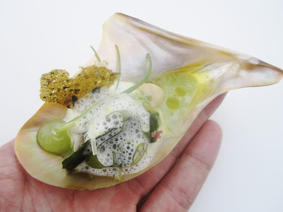Het kleurige proevertje was een 'sablé van parmezaan, frisse klaverzuring (?) en geconfijte rode ui met crème van viseitjes'. Het blijft mooi hoe er achter dergelijke kleine hapjes zulke enorme smaakbommetjes schuil gaan.