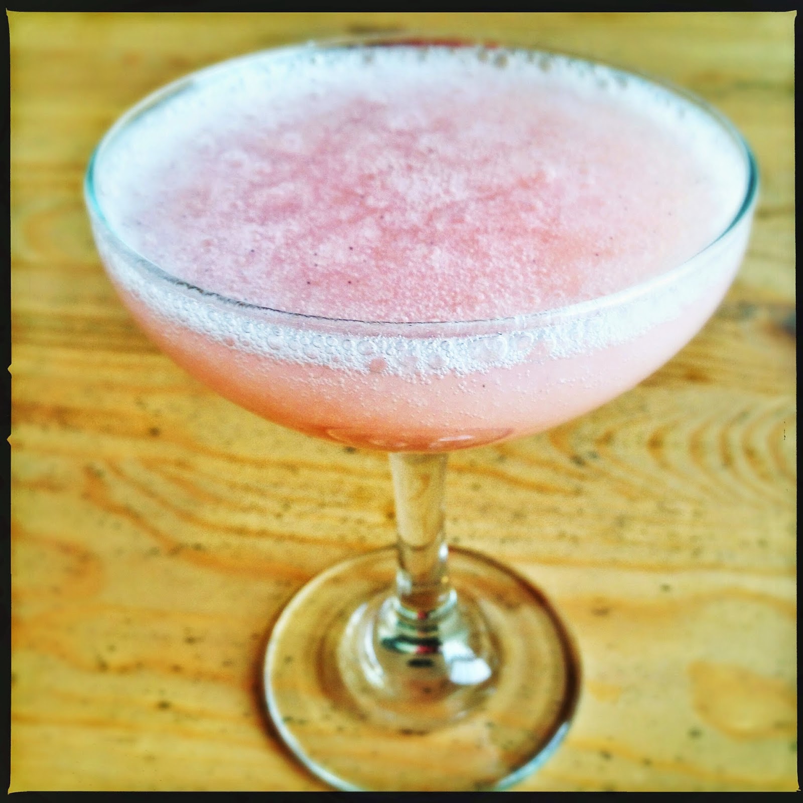 Meng ongeveer 1 eetlepel rabarberpuree met 80 ml champagne (of prosecco, cava of andere mousserende wijn) in een 'mixinglass' en serveer in een mooie coupe. Helemaal terug van weggeweest trouwens, de coupe!